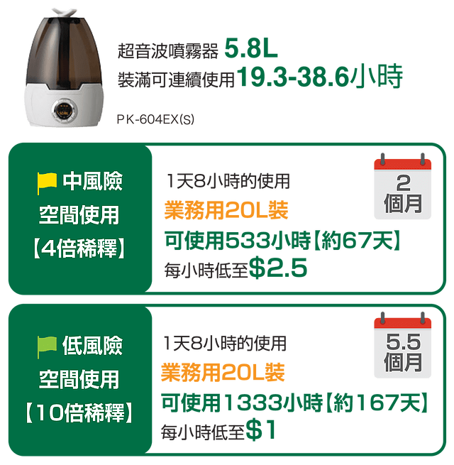 可按照不同場所及情況稀釋不同濃度的滅菌液